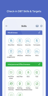 User-friendly diary card for skills and target behaviors. Summary screens to check your progress. Analytics to get insight into your own behavior as you learn new skills. Ability to share with therapists and care team.